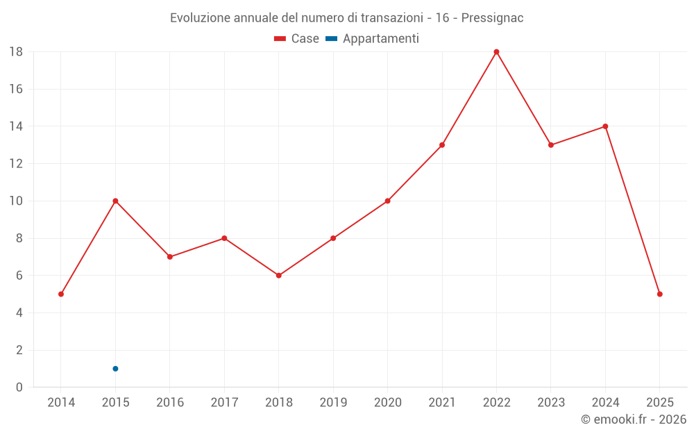 Il prezzo mediano sulle 22 transazioni di case degli ultimi 24 mesi nel comune di Pressignac era di 769 € al metro quadrato per un valore patrimoniale mediano di 92 450 €. In questo periodo il 60% delle transazioni era tra 530 e 1 158 € al metro quadrato (dal 2° all'8° decile).