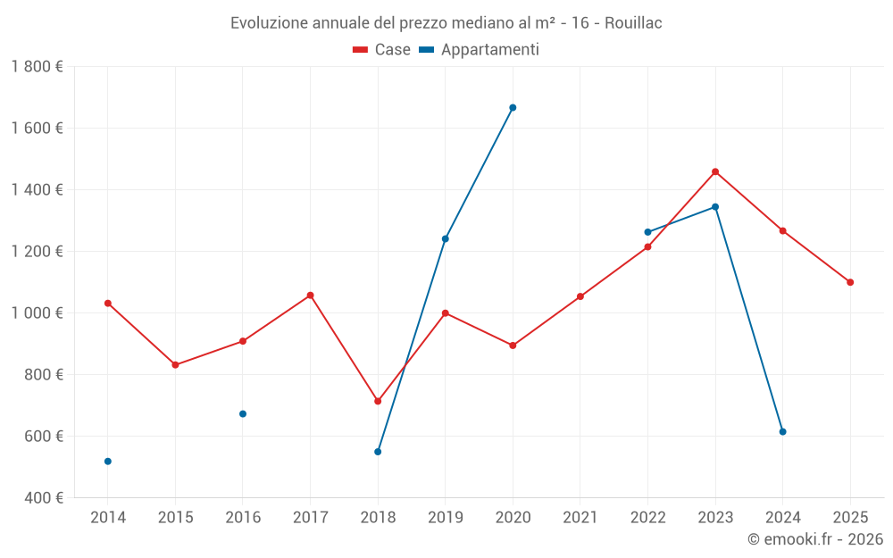 Il prezzo mediano sulle 28 transazioni di case degli ultimi 12 mesi nel comune di Rouillac era di 1 018 € al metro quadrato per un valore patrimoniale mediano di 100 000 €. In questo periodo il 60% delle transazioni era tra 634 e 1 373 € al metro quadrato (dal 2° all'8° decile).