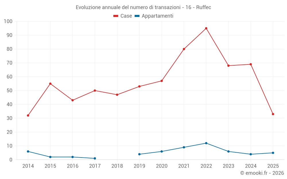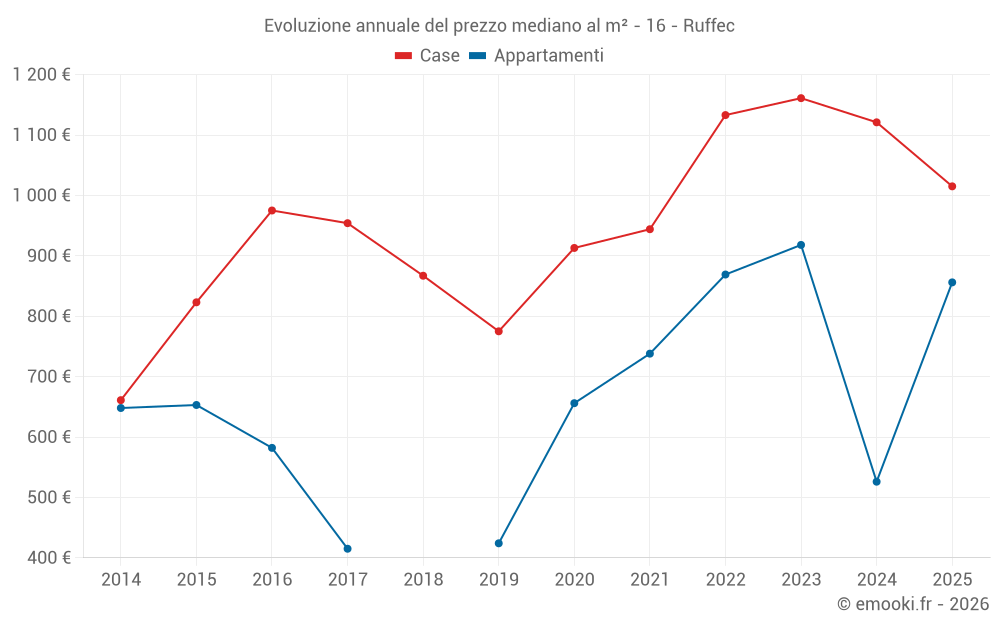 Il prezzo mediano sulle 24 transazioni di case degli ultimi 3 mesi nel comune di Ruffec era di 1 228 € al metro quadrato per un valore patrimoniale mediano di 89 750 €. In questo periodo il 60% delle transazioni era tra 520 e 1 427 € al metro quadrato (dal 2° all'8° decile).