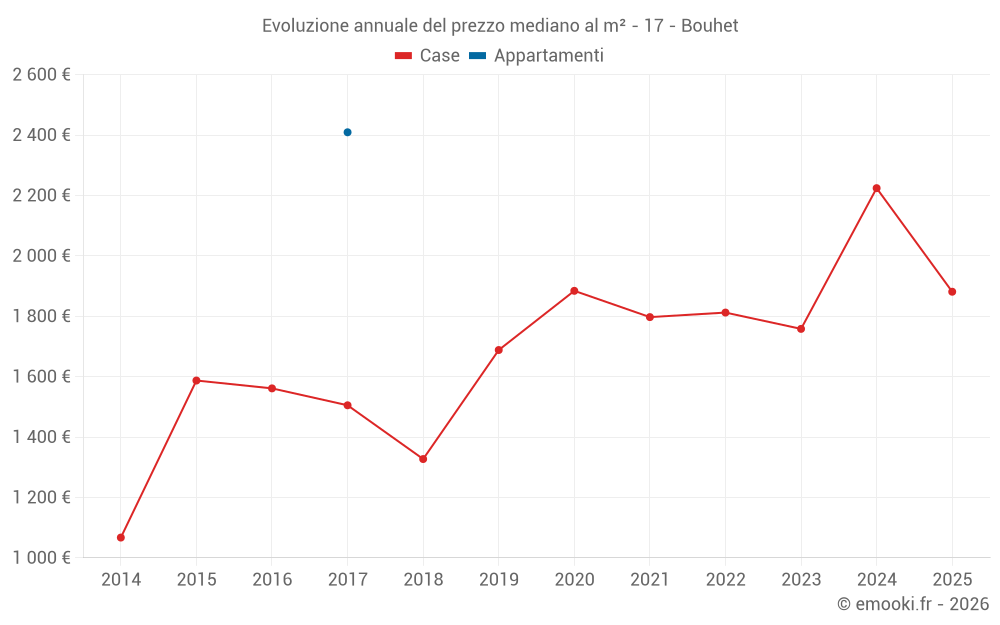 Il prezzo mediano sulle 15 transazioni di case degli ultimi 24 mesi nel comune di Bouhet era di 2 163 € al metro quadrato per un valore patrimoniale mediano di 212 000 €. In questo periodo il 60% delle transazioni era tra 1 451 e 2 536 € al metro quadrato (dal 2° all'8° decile).