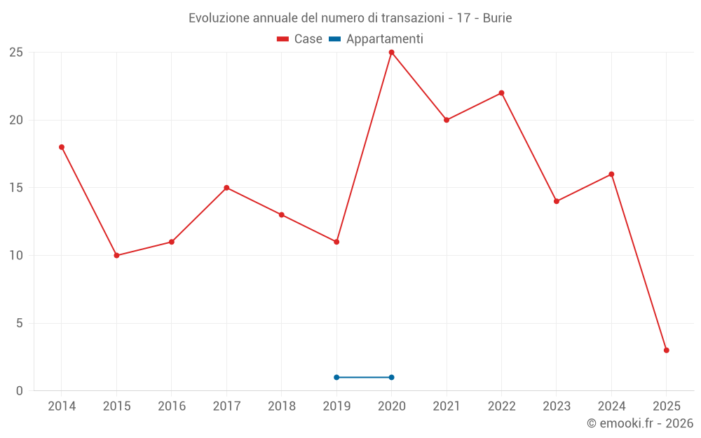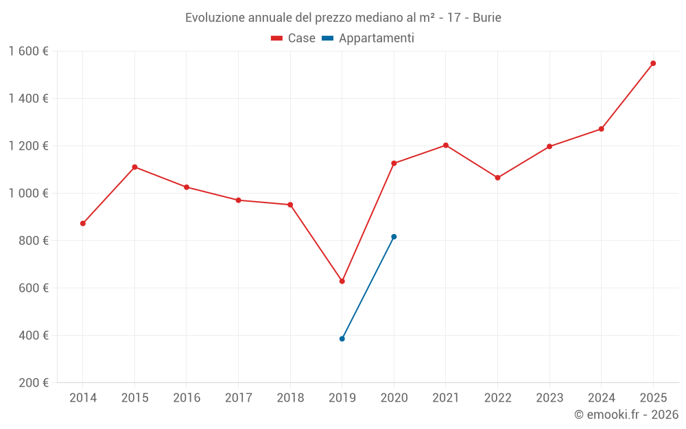Il prezzo mediano sulle 23 transazioni di case degli ultimi 24 mesi nel comune di Burie era di 1 203 € al metro quadrato per un valore patrimoniale mediano di 125 000 €. In questo periodo il 60% delle transazioni era tra 1 018 e 1 782 € al metro quadrato (dal 2° all'8° decile).