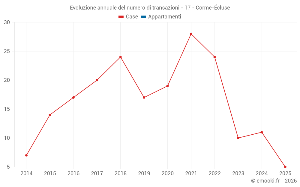 Il prezzo mediano sulle 21 transazioni di case degli ultimi 24 mesi nel comune di Corme-Écluse era di 1 967 € al metro quadrato per un valore patrimoniale mediano di 246 630 €. In questo periodo il 60% delle transazioni era tra 1 246 e 2 769 € al metro quadrato (dal 2° all'8° decile).