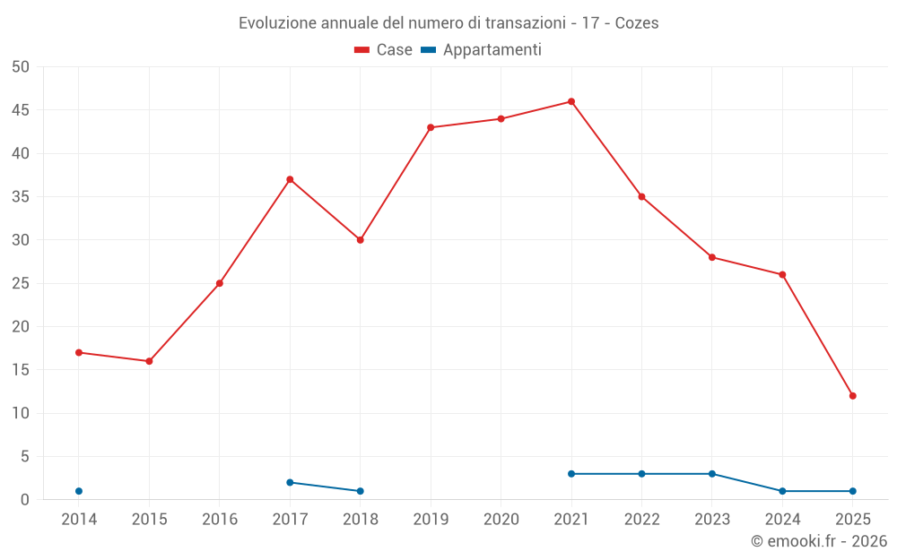Il prezzo mediano sulle 27 transazioni di case degli ultimi 12 mesi nel comune di Cozes era di 2 027 € al metro quadrato per un valore patrimoniale mediano di 240 000 €. In questo periodo il 60% delle transazioni era tra 1 500 e 2 653 € al metro quadrato (dal 2° all'8° decile).