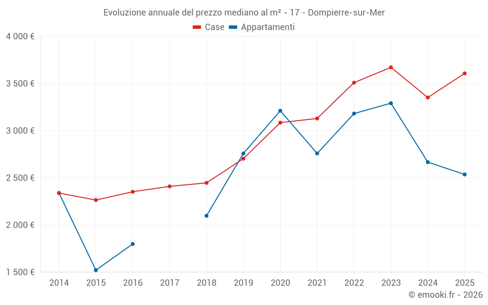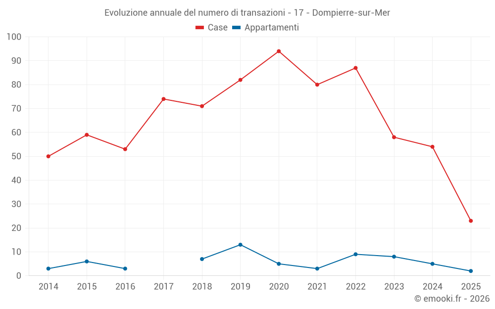 Il prezzo mediano sulle 23 transazioni di case degli ultimi 6 mesi nel comune di Dompierre-sur-Mer era di 3 608 € al metro quadrato per un valore patrimoniale mediano di 321 678 €. In questo periodo il 60% delle transazioni era tra 2 540 e 3 956 € al metro quadrato (dal 2° all'8° decile).