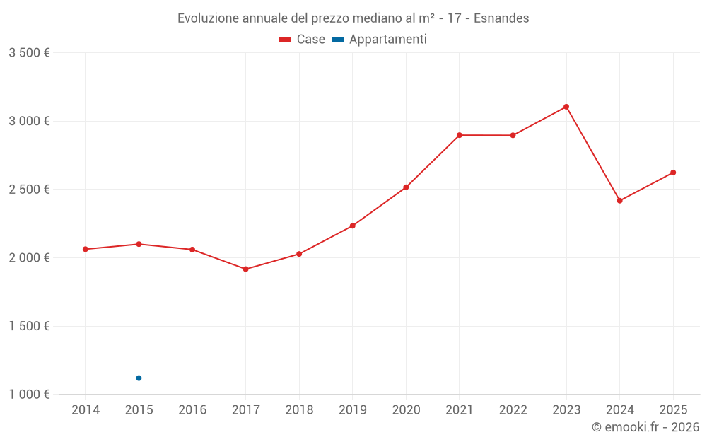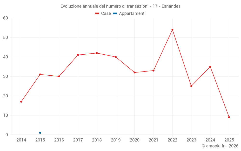 Il prezzo mediano sulle 18 transazioni di case degli ultimi 12 mesi nel comune di Esnandes era di 2 728 € al metro quadrato per un valore patrimoniale mediano di 318 965 €. In questo periodo il 60% delle transazioni era tra 2 297 e 3 499 € al metro quadrato (dal 2° all'8° decile).