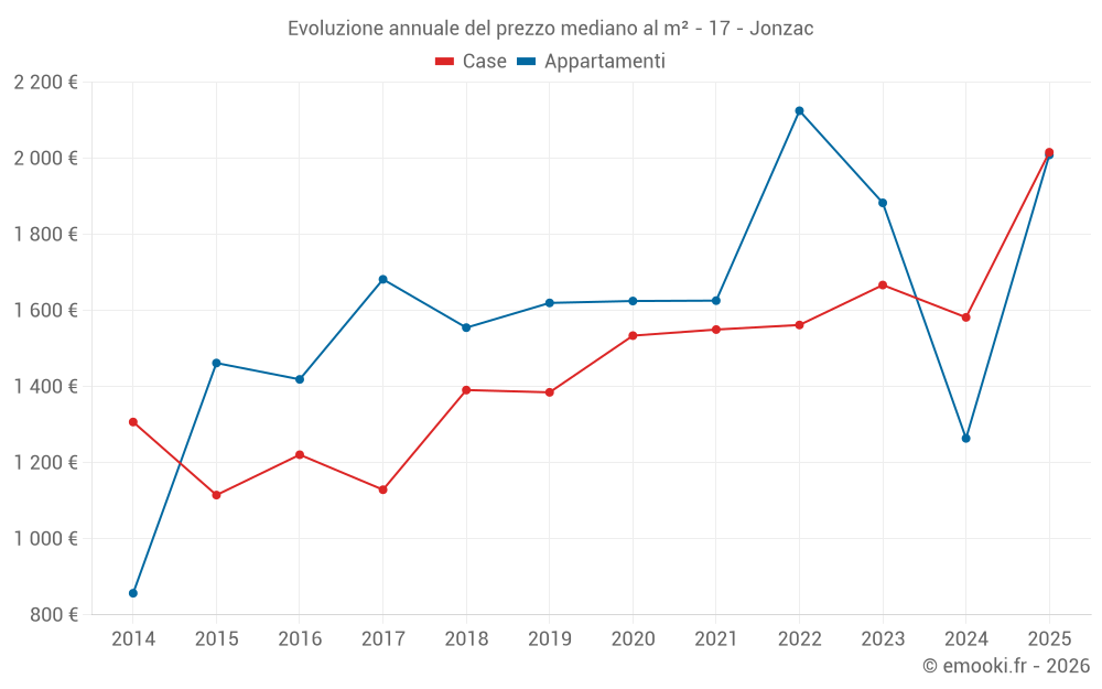 Il prezzo mediano sulle 30 transazioni di case degli ultimi 12 mesi nel comune di Jonzac era di 1 798 € al metro quadrato per un valore patrimoniale mediano di 177 000 €. In questo periodo il 60% delle transazioni era tra 1 141 e 2 162 € al metro quadrato (dal 2° all'8° decile).