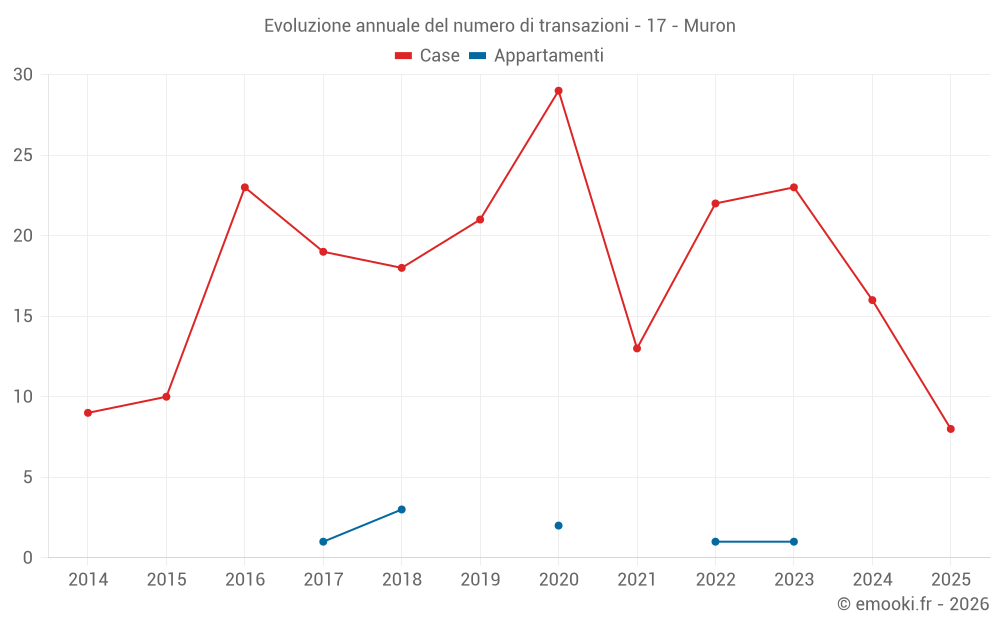 Il prezzo mediano sulle 17 transazioni di case degli ultimi 12 mesi nel comune di Muron era di 1 765 € al metro quadrato per un valore patrimoniale mediano di 165 000 €. In questo periodo il 60% delle transazioni era tra 1 453 e 2 352 € al metro quadrato (dal 2° all'8° decile).