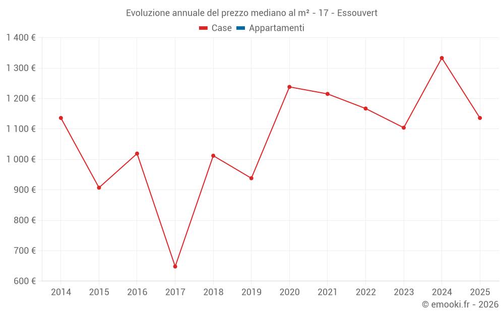 Il prezzo mediano sulle 15 transazioni di case degli ultimi 24 mesi nel comune di Essouvert era di 1 333 € al metro quadrato per un valore patrimoniale mediano di 120 000 €. In questo periodo il 60% delle transazioni era tra 705 e 2 052 € al metro quadrato (dal 2° all'8° decile).