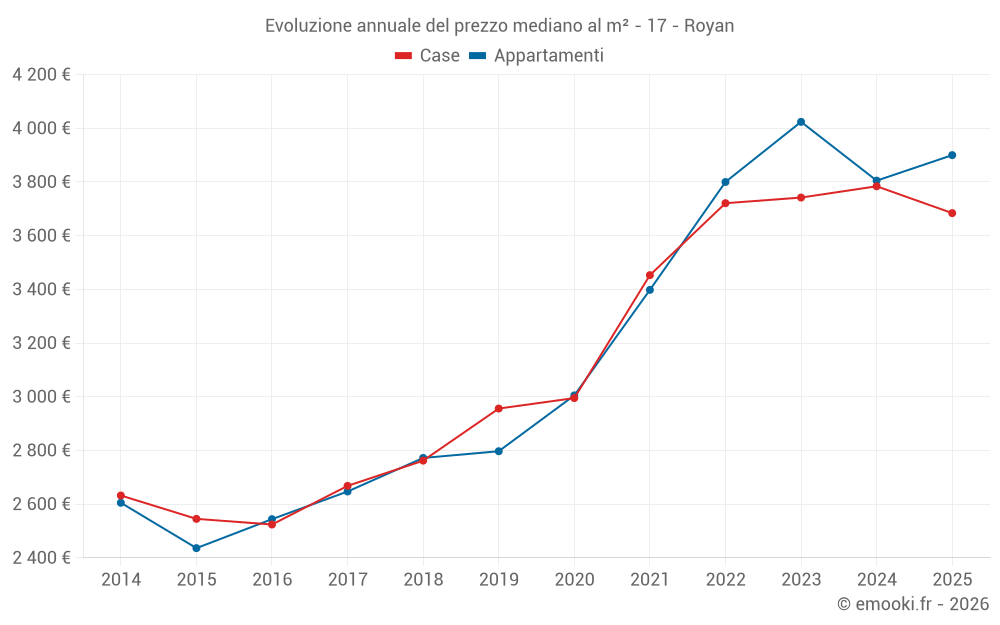Il prezzo mediano sulle 43 transazioni di appartamenti degli ultimi 3 mesi nel comune di Royan era di 3 727 € al metro quadrato per un valore patrimoniale mediano di 178 905 €. In questo periodo il 60% delle transazioni era tra 2 987 e 4 628 € al metro quadrato (dal 2° all'8° decile).