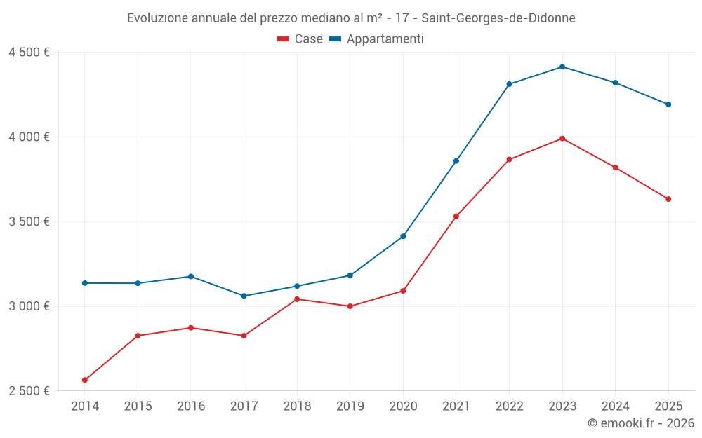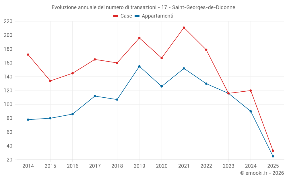 Il prezzo mediano sulle 25 transazioni di appartamenti degli ultimi 6 mesi nel comune di Saint-Georges-de-Didonne era di 4 192 € al metro quadrato per un valore patrimoniale mediano di 141 000 €. In questo periodo il 60% delle transazioni era tra 3 469 e 4 953 € al metro quadrato (dal 2° all'8° decile).