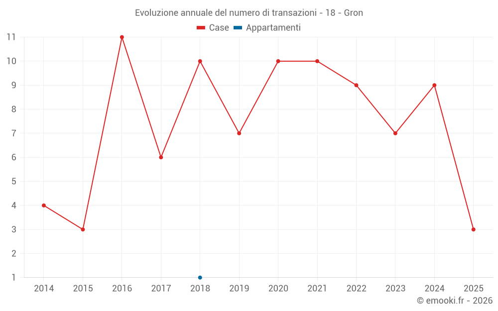 Il prezzo mediano sulle 16 transazioni di case degli ultimi 24 mesi nel comune di Gron era di 842 € al metro quadrato per un valore patrimoniale mediano di 71 000 €. In questo periodo il 60% delle transazioni era tra 426 e 1 039 € al metro quadrato (dal 2° all'8° decile).