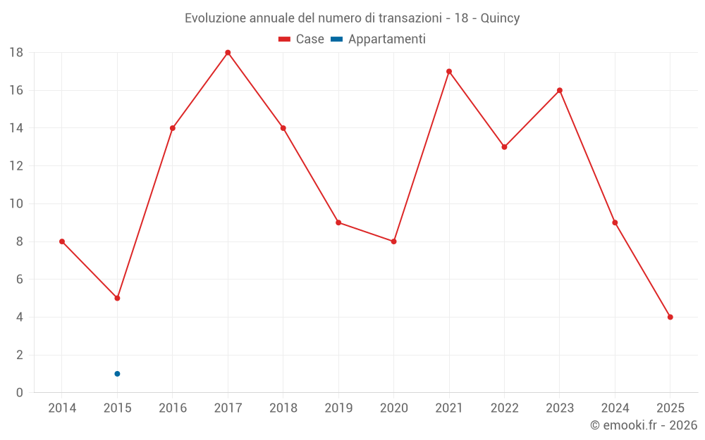 Il prezzo mediano sulle 24 transazioni di case degli ultimi 24 mesi nel comune di Quincy era di 1 140 € al metro quadrato per un valore patrimoniale mediano di 93 000 €. In questo periodo il 60% delle transazioni era tra 595 e 1 563 € al metro quadrato (dal 2° all'8° decile).