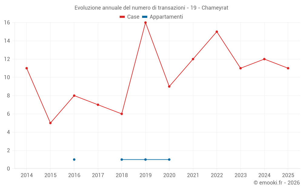 Il prezzo mediano sulle 23 transazioni di case degli ultimi 24 mesi nel comune di Chameyrat era di 1 427 € al metro quadrato per un valore patrimoniale mediano di 117 000 €. In questo periodo il 60% delle transazioni era tra 1 045 e 1 954 € al metro quadrato (dal 2° all'8° decile).
