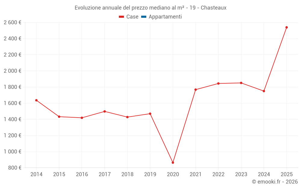 Il prezzo mediano sulle 16 transazioni di case degli ultimi 24 mesi nel comune di Chasteaux era di 1 758 € al metro quadrato per un valore patrimoniale mediano di 119 500 €. In questo periodo il 60% delle transazioni era tra 1 055 e 2 179 € al metro quadrato (dal 2° all'8° decile).