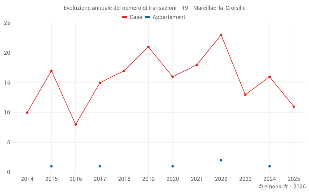 Il prezzo mediano sulle 19 transazioni di case degli ultimi 12 mesi nel comune di Marcillac-la-Croisille era di 1 669 € al metro quadrato per un valore patrimoniale mediano di 161 500 €. In questo periodo il 60% delle transazioni era tra 1 166 e 2 456 € al metro quadrato (dal 2° all'8° decile).