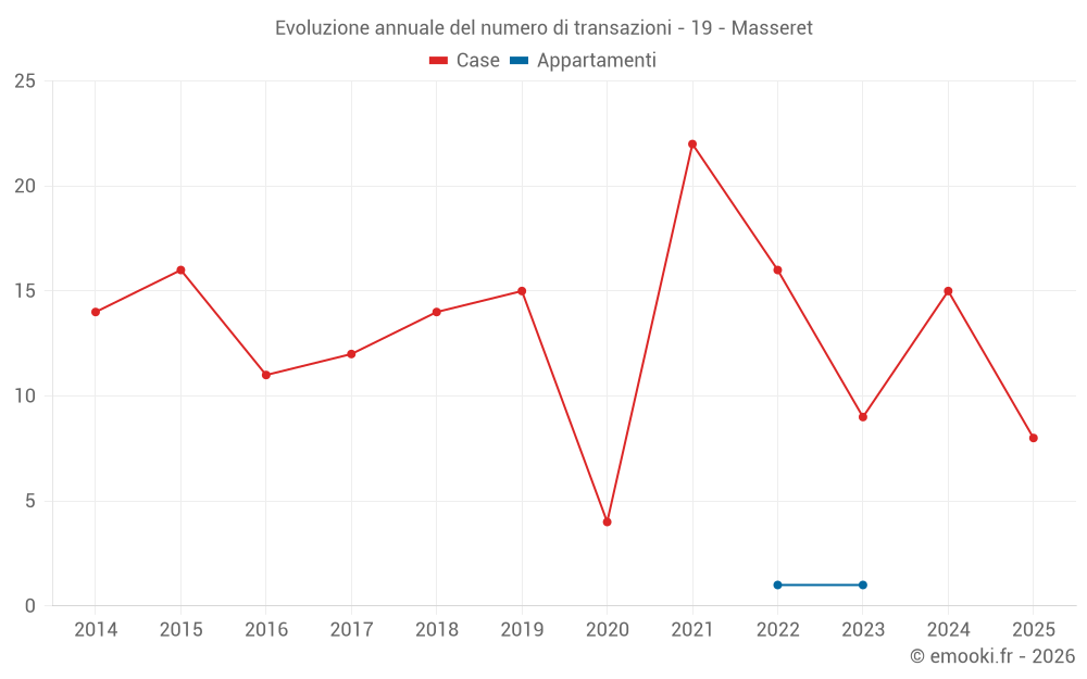 Il prezzo mediano sulle 19 transazioni di case degli ultimi 12 mesi nel comune di Masseret era di 1 380 € al metro quadrato per un valore patrimoniale mediano di 100 000 €. In questo periodo il 60% delle transazioni era tra 1 006 e 1 877 € al metro quadrato (dal 2° all'8° decile).
