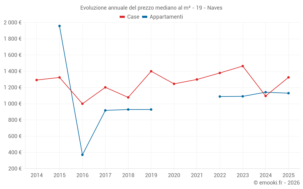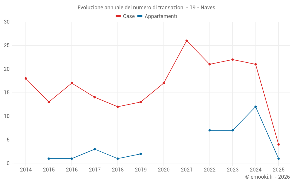 Il prezzo mediano sulle 16 transazioni di appartamenti degli ultimi 24 mesi nel comune di Naves era di 1 142 € al metro quadrato per un valore patrimoniale mediano di 58 500 €. In questo periodo il 60% delle transazioni era tra 1 076 e 1 304 € al metro quadrato (dal 2° all'8° decile).