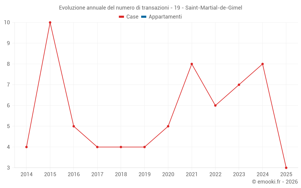 Il prezzo mediano sulle 15 transazioni di case degli ultimi 24 mesi nel comune di Saint-Martial-de-Gimel era di 1 182 € al metro quadrato per un valore patrimoniale mediano di 106 000 €. In questo periodo il 60% delle transazioni era tra 813 e 1 494 € al metro quadrato (dal 2° all'8° decile).