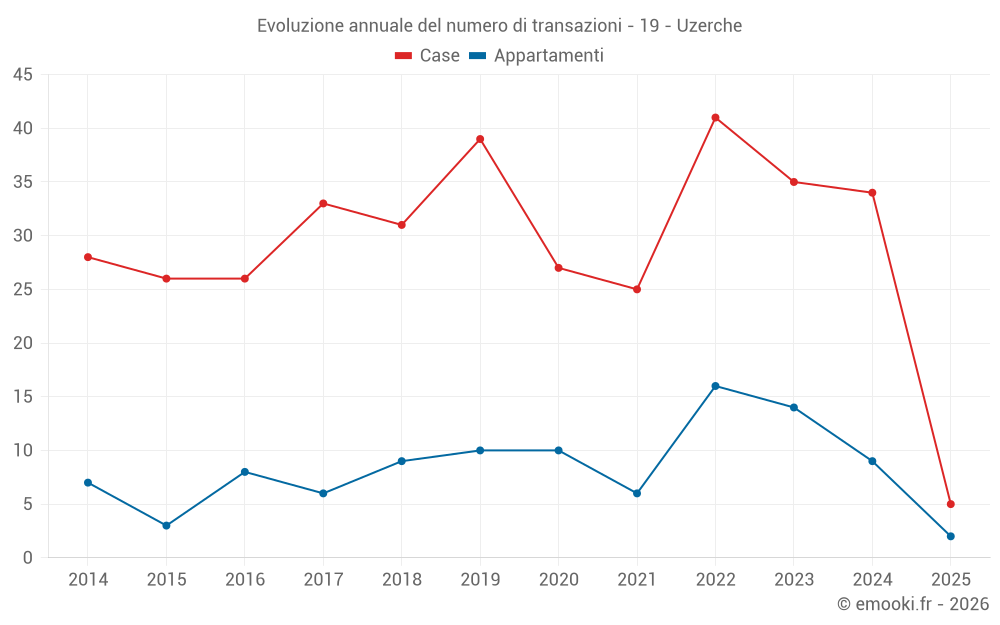 Il prezzo mediano sulle 16 transazioni di appartamenti degli ultimi 24 mesi nel comune di Uzerche era di 619 € al metro quadrato per un valore patrimoniale mediano di 50 000 €. In questo periodo il 60% delle transazioni era tra 261 e 885 € al metro quadrato (dal 2° all'8° decile).