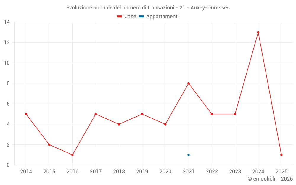 Il prezzo mediano sulle 18 transazioni di case degli ultimi 24 mesi nel comune di Auxey-Duresses era di 2 241 € al metro quadrato per un valore patrimoniale mediano di 223 150 €. In questo periodo il 60% delle transazioni era tra 1 033 e 2 880 € al metro quadrato (dal 2° all'8° decile).