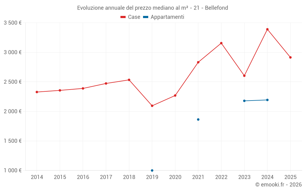 Il prezzo mediano sulle 14 transazioni di case degli ultimi 24 mesi nel comune di Bellefond era di 3 074 € al metro quadrato per un valore patrimoniale mediano di 330 425 €. In questo periodo il 60% delle transazioni era tra 2 750 e 3 606 € al metro quadrato (dal 2° all'8° decile).