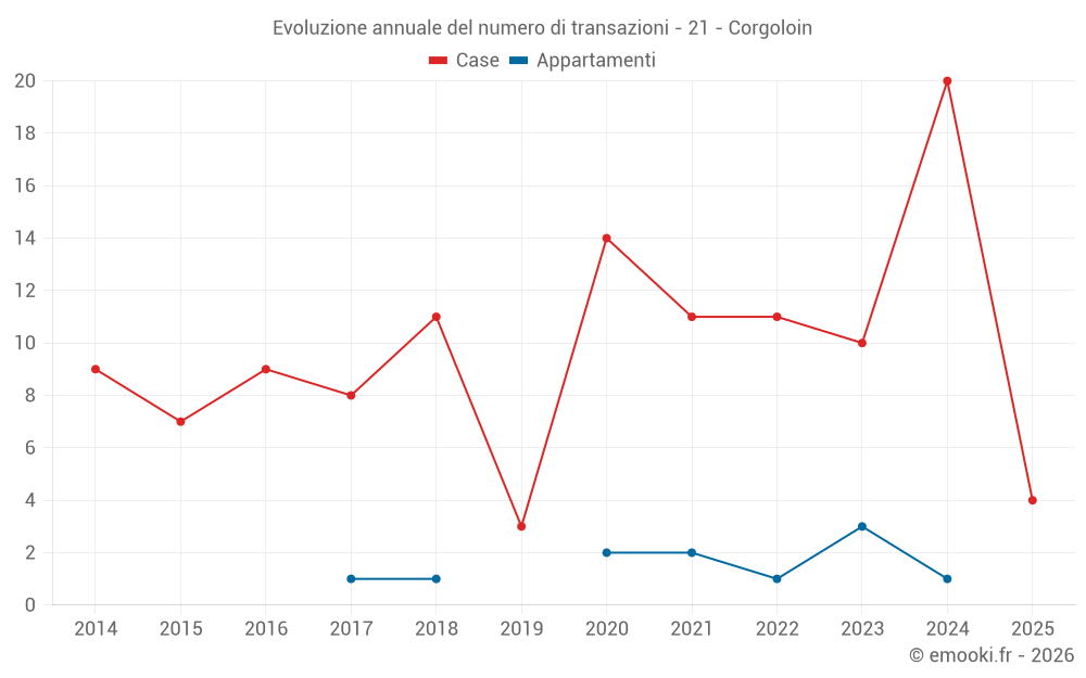 Il prezzo mediano sulle 29 transazioni di case degli ultimi 24 mesi nel comune di Corgoloin era di 1 997 € al metro quadrato per un valore patrimoniale mediano di 212 000 €. In questo periodo il 60% delle transazioni era tra 1 641 e 2 634 € al metro quadrato (dal 2° all'8° decile).