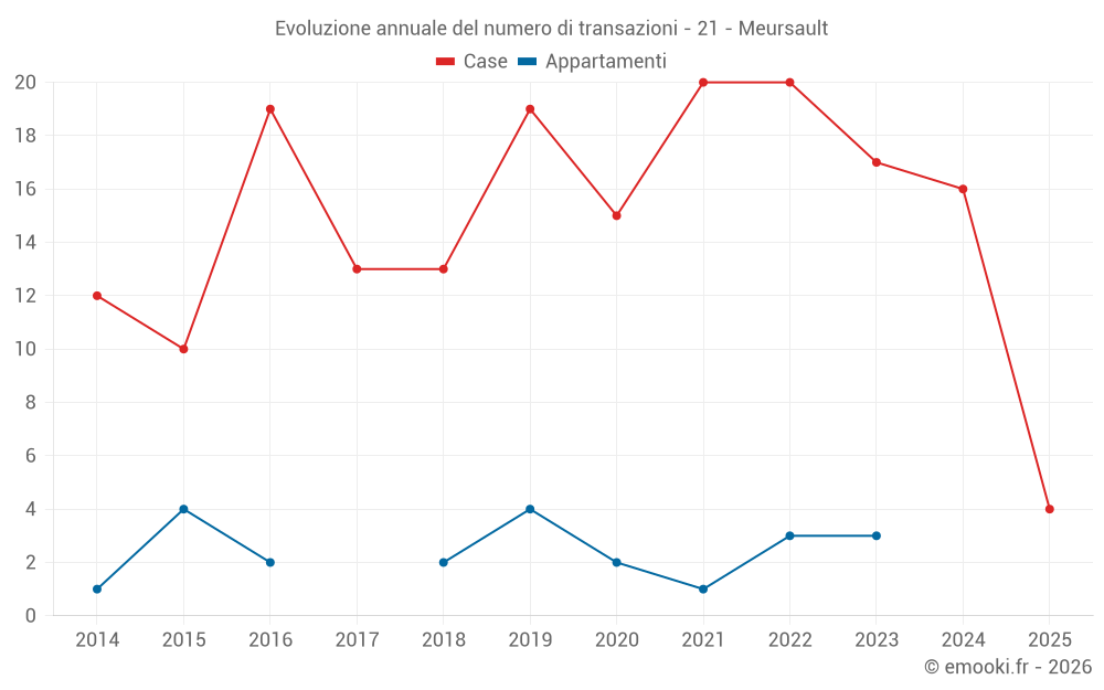 Il prezzo mediano sulle 16 transazioni di case degli ultimi 12 mesi nel comune di Meursault era di 2 893 € al metro quadrato per un valore patrimoniale mediano di 425 000 €. In questo periodo il 60% delle transazioni era tra 2 419 e 4 315 € al metro quadrato (dal 2° all'8° decile).