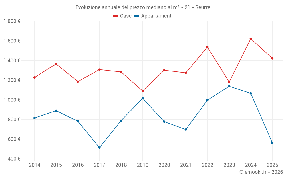 Il prezzo mediano sulle 22 transazioni di appartamenti degli ultimi 24 mesi nel comune di Seurre era di 896 € al metro quadrato per un valore patrimoniale mediano di 83 500 €. In questo periodo il 60% delle transazioni era tra 475 e 1 165 € al metro quadrato (dal 2° all'8° decile).