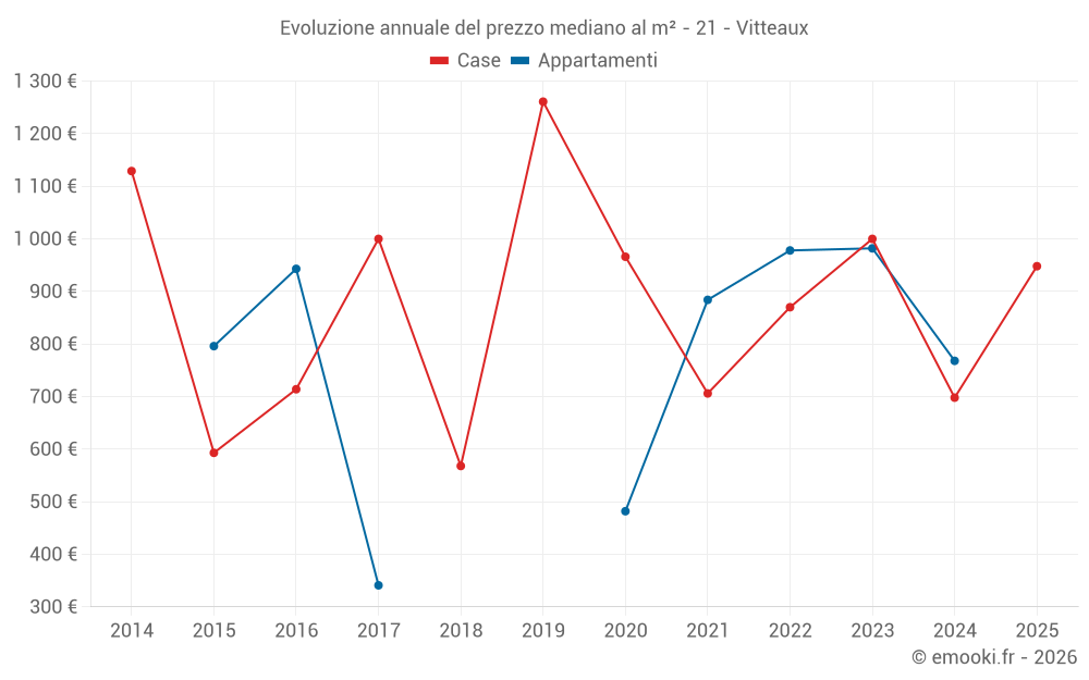 Il prezzo mediano sulle 24 transazioni di case degli ultimi 24 mesi nel comune di Vitteaux era di 938 € al metro quadrato per un valore patrimoniale mediano di 72 000 €. In questo periodo il 60% delle transazioni era tra 511 e 1 241 € al metro quadrato (dal 2° all'8° decile).