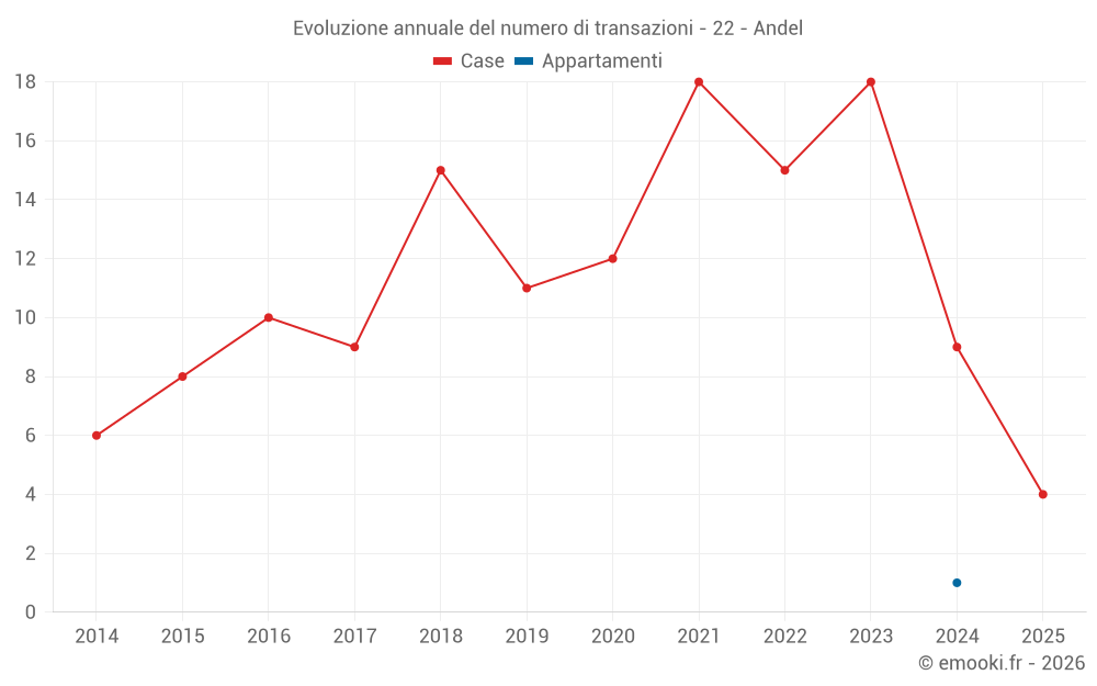 Il prezzo mediano sulle 26 transazioni di case degli ultimi 24 mesi nel comune di Andel era di 2 128 € al metro quadrato per un valore patrimoniale mediano di 222 848 €. In questo periodo il 60% delle transazioni era tra 1 712 e 2 648 € al metro quadrato (dal 2° all'8° decile).