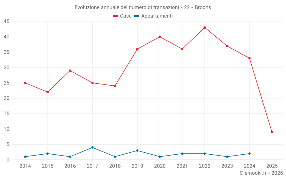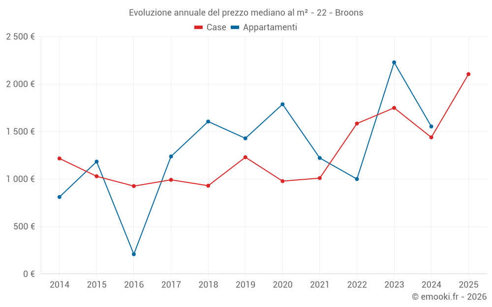 Il prezzo mediano sulle 25 transazioni di case degli ultimi 12 mesi nel comune di Broons era di 1 628 € al metro quadrato per un valore patrimoniale mediano di 165 000 €. In questo periodo il 60% delle transazioni era tra 861 e 2 182 € al metro quadrato (dal 2° all'8° decile).