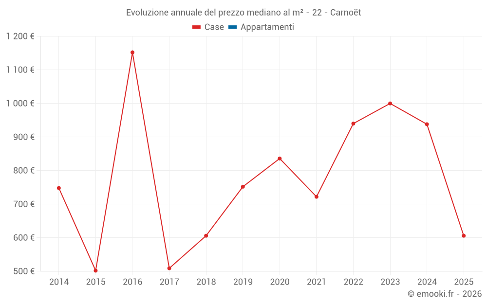 Il prezzo mediano sulle 16 transazioni di case degli ultimi 12 mesi nel comune di Carnoët era di 1 000 € al metro quadrato per un valore patrimoniale mediano di 53 500 €. In questo periodo il 60% delle transazioni era tra 373 e 1 285 € al metro quadrato (dal 2° all'8° decile).