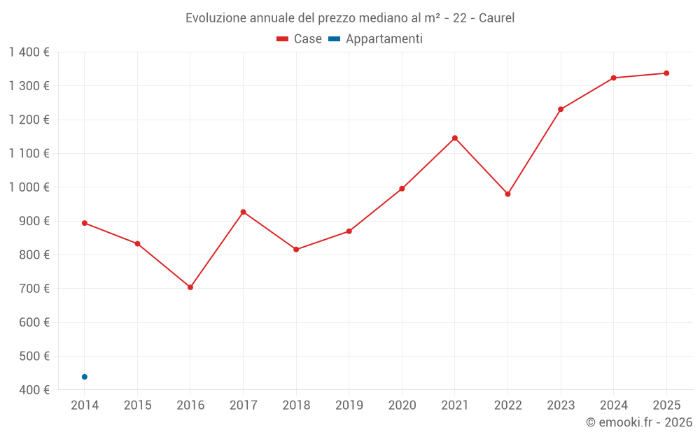 Il prezzo mediano sulle 25 transazioni di case degli ultimi 24 mesi nel comune di Caurel era di 1 324 € al metro quadrato per un valore patrimoniale mediano di 100 000 €. In questo periodo il 60% delle transazioni era tra 977 e 2 051 € al metro quadrato (dal 2° all'8° decile).