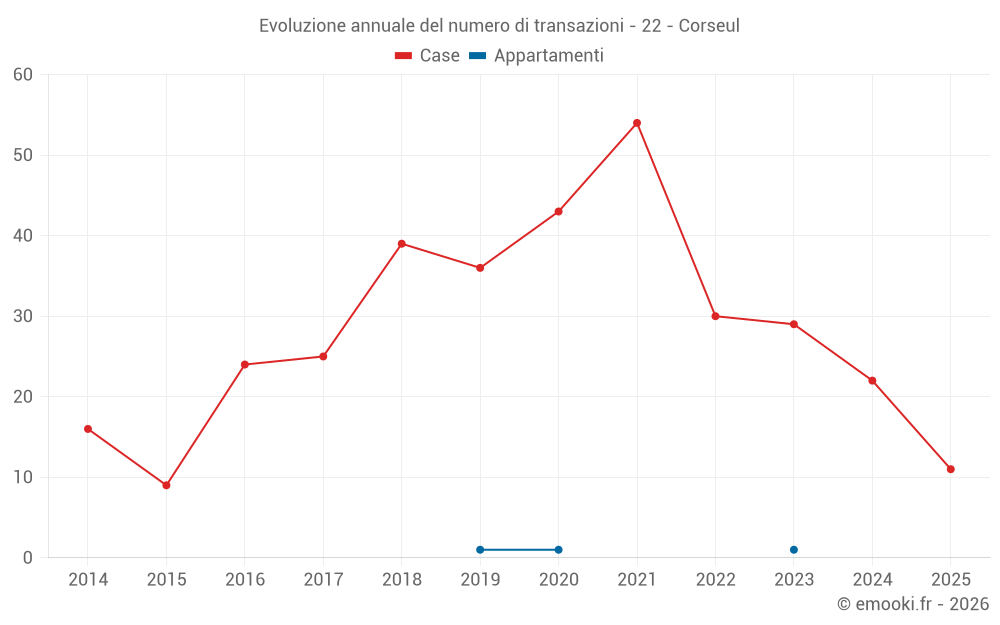 Il prezzo mediano sulle 26 transazioni di case degli ultimi 12 mesi nel comune di Corseul era di 2 044 € al metro quadrato per un valore patrimoniale mediano di 201 500 €. In questo periodo il 60% delle transazioni era tra 1 611 e 3 000 € al metro quadrato (dal 2° all'8° decile).