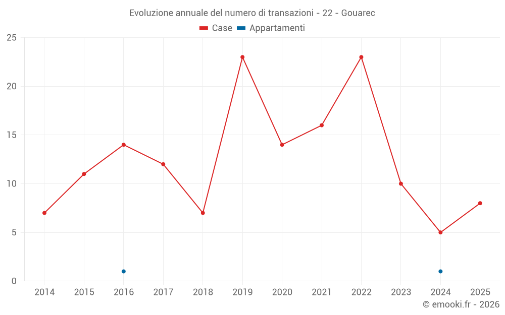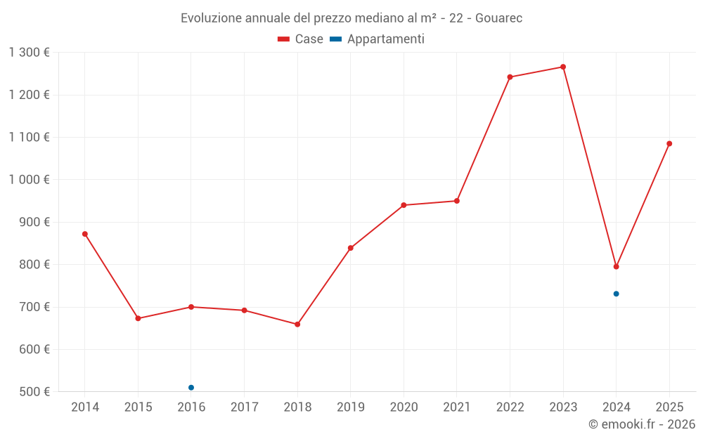 Il prezzo mediano sulle 18 transazioni di case degli ultimi 24 mesi nel comune di Gouarec era di 1 200 € al metro quadrato per un valore patrimoniale mediano di 115 000 €. In questo periodo il 60% delle transazioni era tra 849 e 1 460 € al metro quadrato (dal 2° all'8° decile).