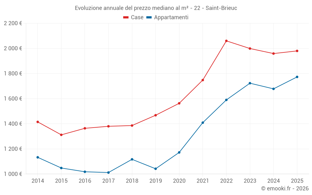 Il prezzo mediano sulle 40 transazioni di case degli ultimi 3 mesi nel comune di Saint-Brieuc era di 1 904 € al metro quadrato per un valore patrimoniale mediano di 184 662 €. In questo periodo il 60% delle transazioni era tra 1 405 e 2 379 € al metro quadrato (dal 2° all'8° decile).