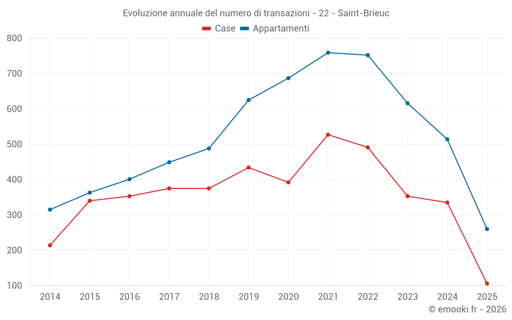 Il prezzo mediano sulle 118 transazioni di appartamenti degli ultimi 3 mesi nel comune di Saint-Brieuc era di 1 826 € al metro quadrato per un valore patrimoniale mediano di 102 000 €. In questo periodo il 60% delle transazioni era tra 1 438 e 2 285 € al metro quadrato (dal 2° all'8° decile).