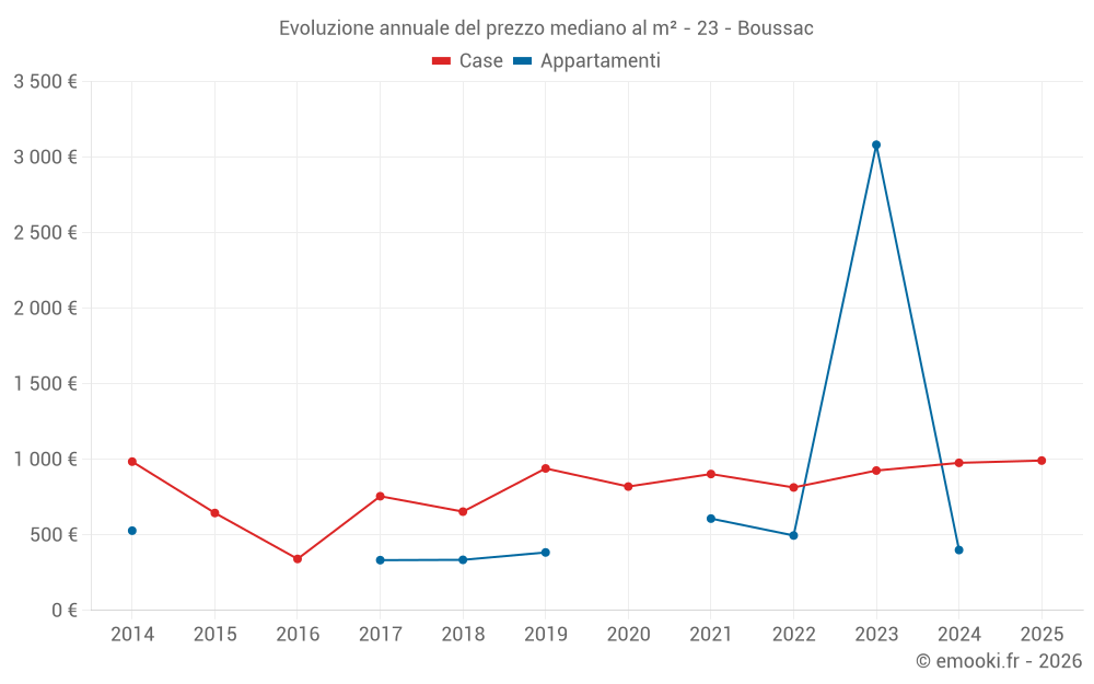 Il prezzo mediano sulle 16 transazioni di case degli ultimi 12 mesi nel comune di Boussac era di 892 € al metro quadrato per un valore patrimoniale mediano di 88 500 €. In questo periodo il 60% delle transazioni era tra 745 e 1 358 € al metro quadrato (dal 2° all'8° decile).
