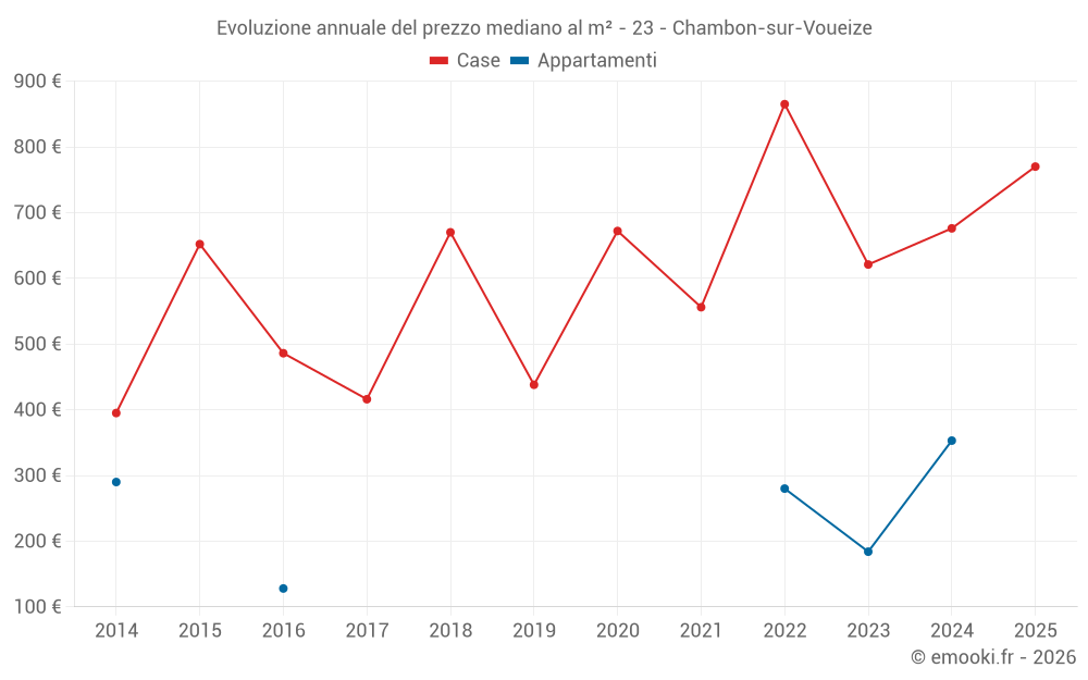 Il prezzo mediano sulle 17 transazioni di case degli ultimi 24 mesi nel comune di Chambon-sur-Voueize era di 676 € al metro quadrato per un valore patrimoniale mediano di 51 380 €. In questo periodo il 60% delle transazioni era tra 397 e 1 073 € al metro quadrato (dal 2° all'8° decile).