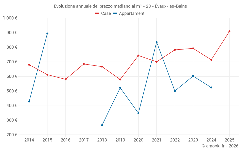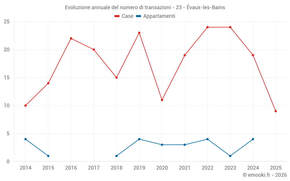 Il prezzo mediano sulle 21 transazioni di case degli ultimi 12 mesi nel comune di Évaux-les-Bains era di 824 € al metro quadrato per un valore patrimoniale mediano di 64 000 €. In questo periodo il 60% delle transazioni era tra 400 e 1 352 € al metro quadrato (dal 2° all'8° decile).