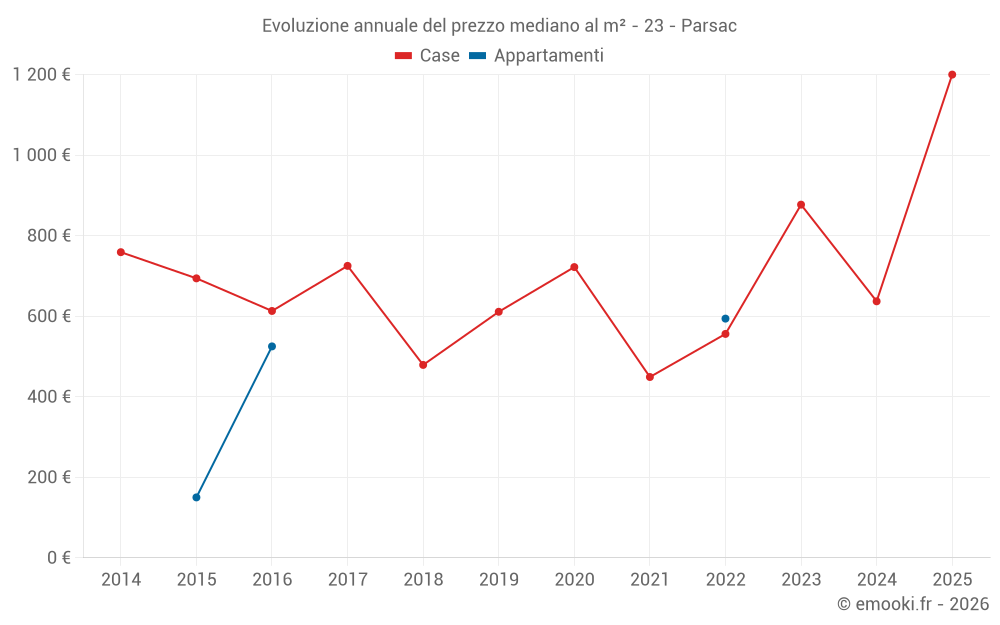 Il prezzo mediano sulle 32 transazioni di case degli ultimi 24 mesi nel comune di Parsac era di 730 € al metro quadrato per un valore patrimoniale mediano di 68 250 €. In questo periodo il 60% delle transazioni era tra 395 e 1 188 € al metro quadrato (dal 2° all'8° decile).