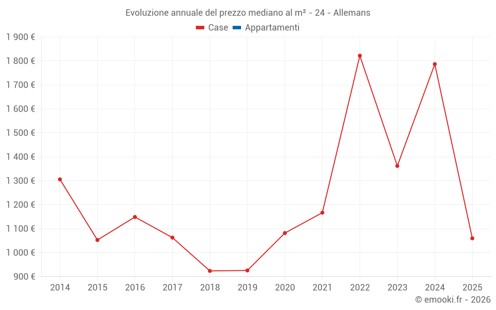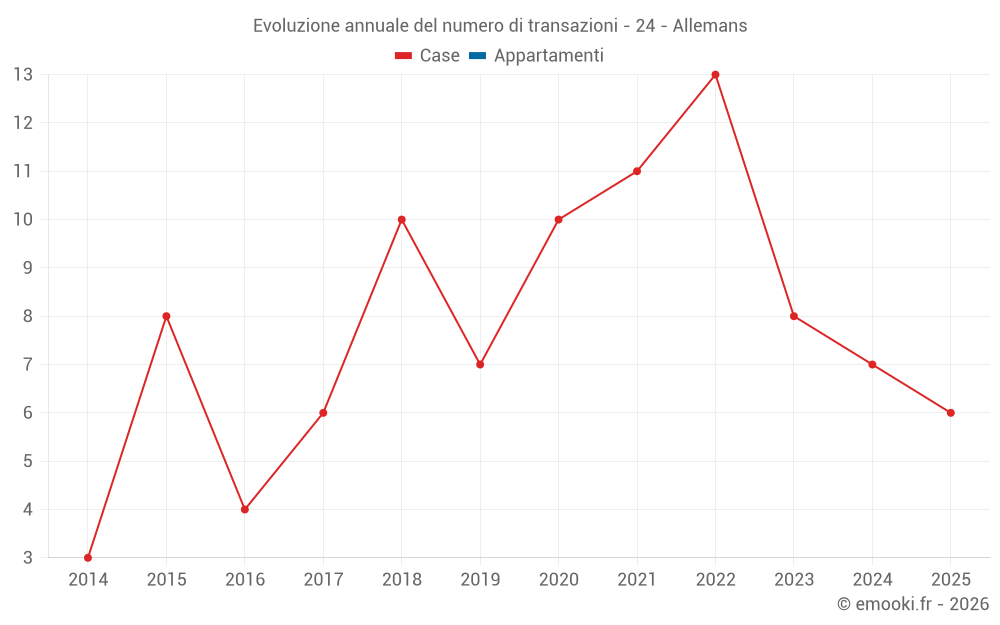 Il prezzo mediano sulle 16 transazioni di case degli ultimi 24 mesi nel comune di Allemans era di 1 400 € al metro quadrato per un valore patrimoniale mediano di 157 000 €. In questo periodo il 60% delle transazioni era tra 826 e 1 931 € al metro quadrato (dal 2° all'8° decile).