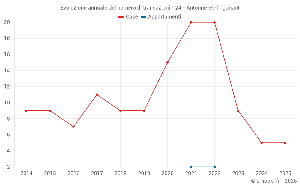 Il prezzo mediano sulle 15 transazioni di case degli ultimi 24 mesi nel comune di Antonne-et-Trigonant era di 1 500 € al metro quadrato per un valore patrimoniale mediano di 132 000 €. In questo periodo il 60% delle transazioni era tra 1 179 e 1 968 € al metro quadrato (dal 2° all'8° decile).