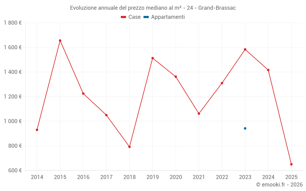Il prezzo mediano sulle 14 transazioni di case degli ultimi 24 mesi nel comune di Grand-Brassac era di 1 584 € al metro quadrato per un valore patrimoniale mediano di 160 500 €. In questo periodo il 60% delle transazioni era tra 934 e 1 869 € al metro quadrato (dal 2° all'8° decile).