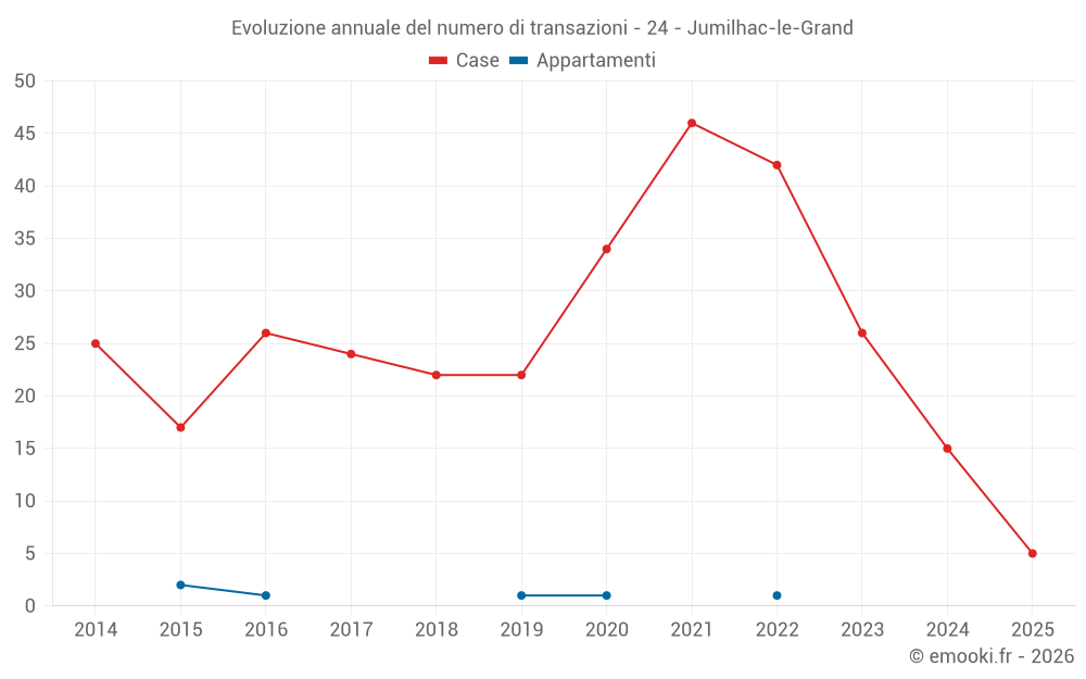 Il prezzo mediano sulle 31 transazioni di case degli ultimi 24 mesi nel comune di Jumilhac-le-Grand era di 1 296 € al metro quadrato per un valore patrimoniale mediano di 130 000 €. In questo periodo il 60% delle transazioni era tra 758 e 2 136 € al metro quadrato (dal 2° all'8° decile).