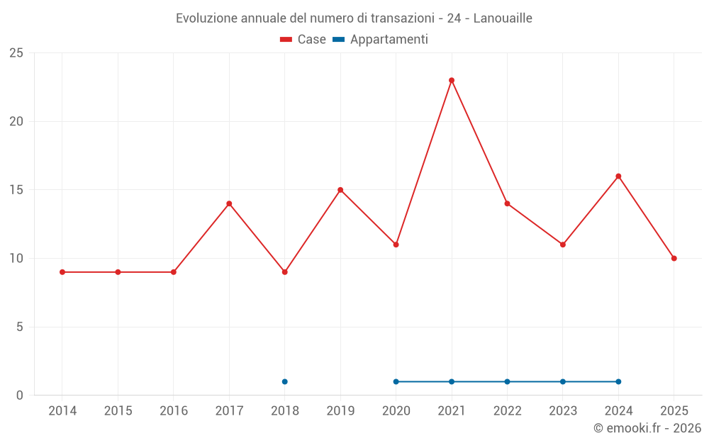 Il prezzo mediano sulle 19 transazioni di case degli ultimi 12 mesi nel comune di Lanouaille era di 1 264 € al metro quadrato per un valore patrimoniale mediano di 97 040 €. In questo periodo il 60% delle transazioni era tra 661 e 1 883 € al metro quadrato (dal 2° all'8° decile).