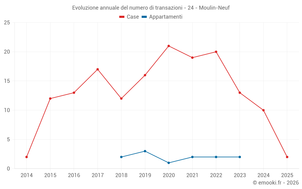 Il prezzo mediano sulle 18 transazioni di case degli ultimi 24 mesi nel comune di Moulin-Neuf era di 1 628 € al metro quadrato per un valore patrimoniale mediano di 157 500 €. In questo periodo il 60% delle transazioni era tra 1 172 e 2 167 € al metro quadrato (dal 2° all'8° decile).