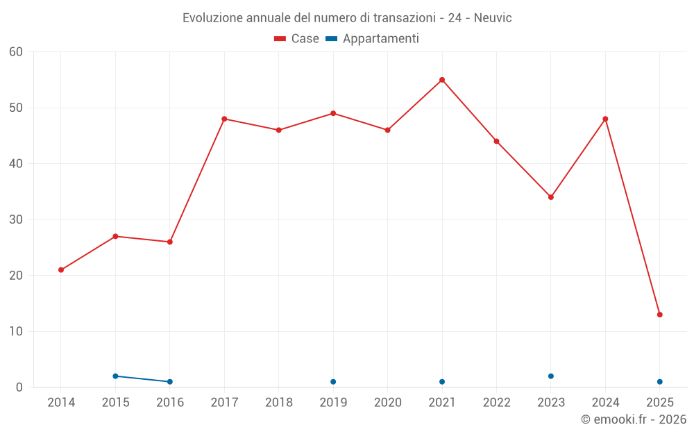 Il prezzo mediano sulle 38 transazioni di case degli ultimi 12 mesi nel comune di Neuvic era di 1 532 € al metro quadrato per un valore patrimoniale mediano di 146 050 €. In questo periodo il 60% delle transazioni era tra 853 e 2 011 € al metro quadrato (dal 2° all'8° decile).