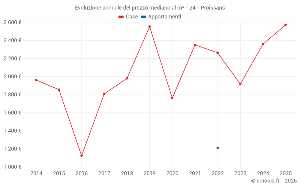 Il prezzo mediano sulle 15 transazioni di case degli ultimi 24 mesi nel comune di Proissans era di 2 305 € al metro quadrato per un valore patrimoniale mediano di 225 000 €. In questo periodo il 60% delle transazioni era tra 1 635 e 2 918 € al metro quadrato (dal 2° all'8° decile).