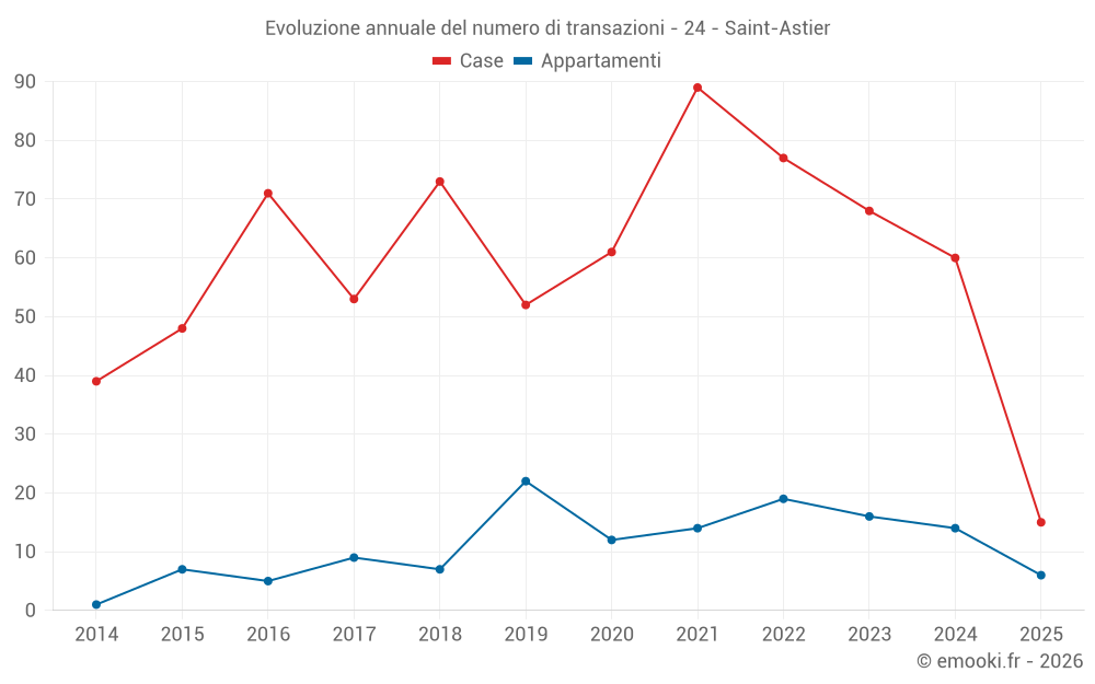Il prezzo mediano sulle 53 transazioni di case degli ultimi 12 mesi nel comune di Saint-Astier era di 1 522 € al metro quadrato per un valore patrimoniale mediano di 140 000 €. In questo periodo il 60% delle transazioni era tra 1 074 e 2 013 € al metro quadrato (dal 2° all'8° decile).